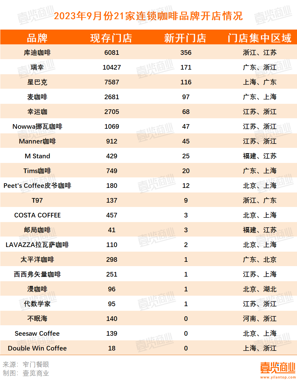 從整體開店數(shù)量看:2023年9月份,國內(nèi)21家連鎖咖啡品牌一共新開門店978家。現(xiàn)存門店一共38126家。